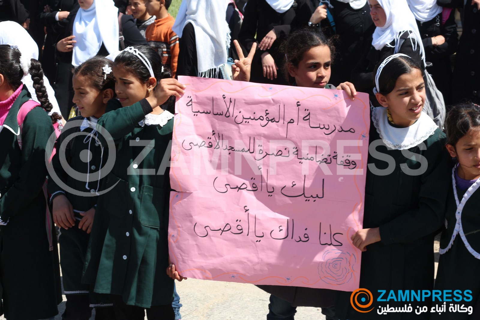 نظمت طالبات مدرسة الخنساء الثانوية شرق مدينة خانيونس، صباح اليوم، وقفة تضامنية لنصرة المسجد الأقصى. عدسة : مهند قديح.