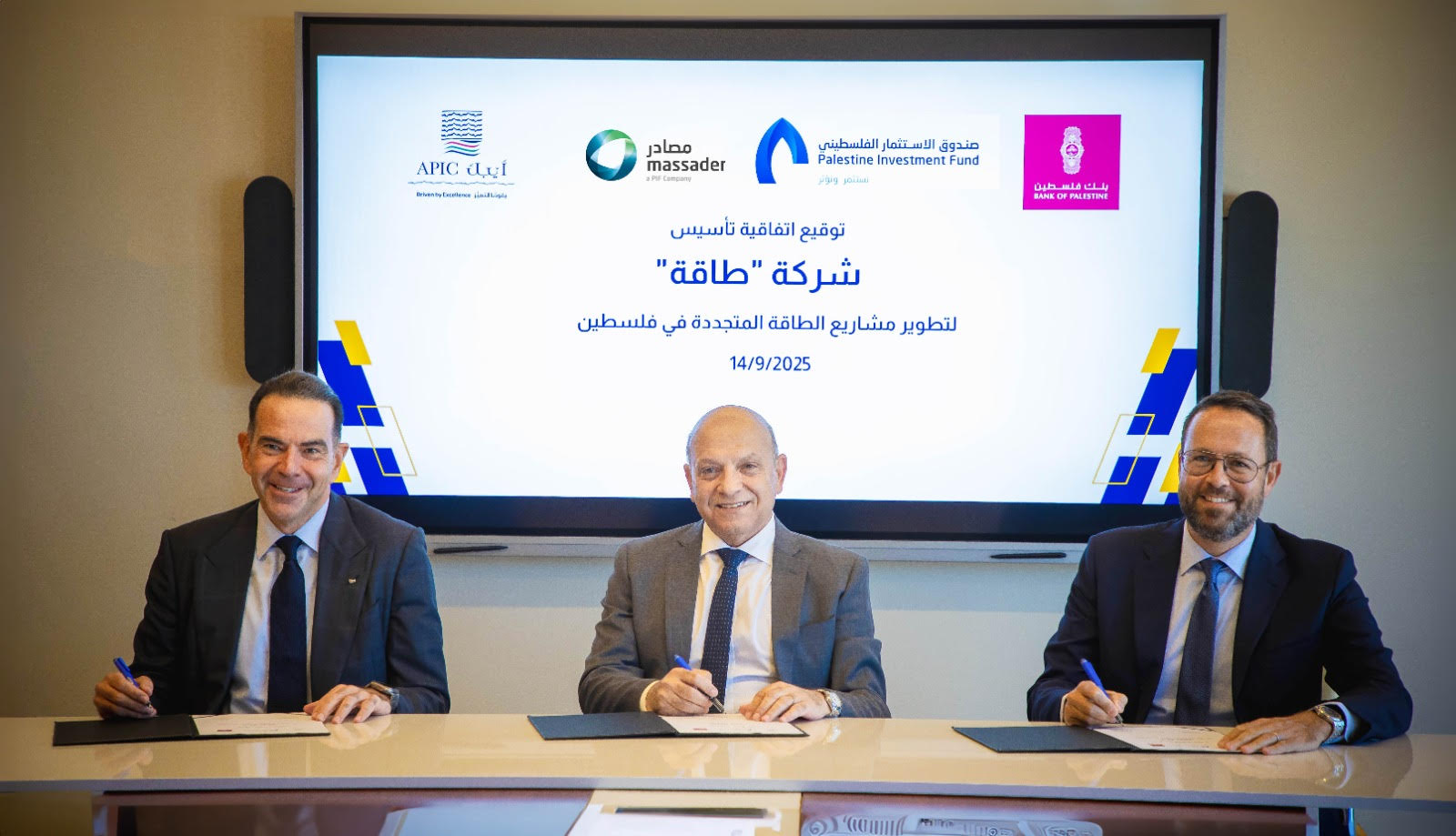 زمن برس، فلسطين:   وقّعت كل من شركة مصادر، الذراع الاستثمارية لصندوق الاستثمار الفلسطيني في قطاع الطاقة، والشركة العربية الفلسطينية للاستثمار (أيبك)، ومجموعة بنك فلسطين، اتفاقية شراكة استراتيجية لتأسيس شركة "طاقة"، التي ستُشكّل كياناً اقتصادياً واستثمارياً وتطويرياً رائداًلتعزيز قطاع الطاقة المتجددة في فلسطين.
