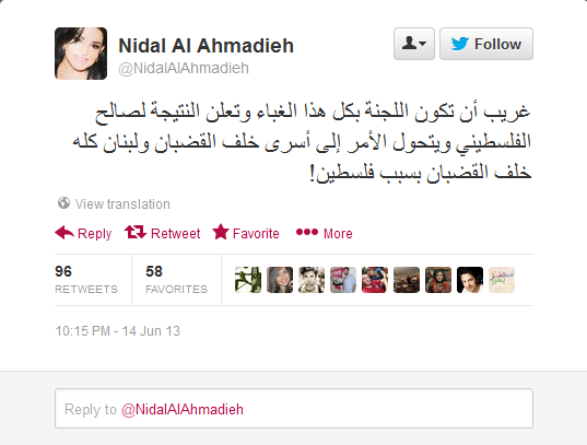بيروت: أثار تعليق نشرته الإعلامية اللبنانية نضال الأحمدية، الجمعة، ضجة بين مستخدمي موقع التواصل الاجتماعي تويتر، عندما ذكرت المشترك الفلسطيني في برنامج "أراب أيدول" محمد العساف، في تغريدتها قائلة: "غريب أن تكون اللجنة بكل هذا الغباء وتعلن النتيجة لصالح الفلسطيني ويتحول الأمر إلى أسرى خلف القضبان ولبنان كله خلف القضبان بسبب فلسطين!"