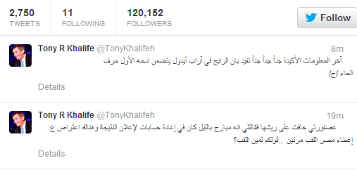وعبر خليفة في تغريدة أخرى لاحقة عن عدم معرفته بالنتيجة قائلاً" آخر المعلومات الأكيدة جداً جداً جداً تفيد بان الرابح في آراب أيدول يتضمن اسمه الأول حرف الحاء" علماً بأن المتسابقين الثلاثة أسماؤهم تحتوي على هذا الحرف.