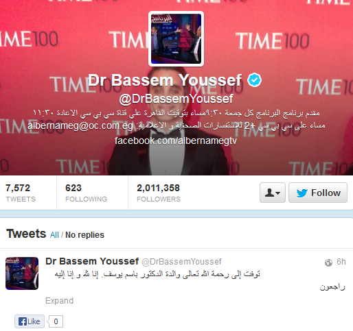 وقالت صحيفة الحياة اللندنية أن نص تغريدته: «توفت إلى رحمة الله تعالى والدة الدكتور باسم يوسف. إنا لله و إنا إليه راجعون»، واكتفى يوسف بهذه التغريدة ولم يعلن أي تفاصيل أخرى.