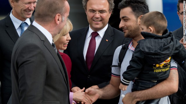 وزير الداخلية الألماني، هانز فريدريش، أثناء زيارته لسوريين منحوا اللجوء المؤقت في بلاده.