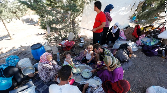 سوريون يتناولون الطعام تحت الأشجار بعدما فشلوا في عبور الحدود التركية.