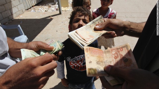 أطفال سوريون يقفون بالقرب من بعض الصرافين في مخيم الزعتري للاجئين بالأردن.