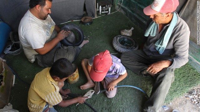 سوري يعمل بإصلاح الاطارت في مخيم الزعتري.