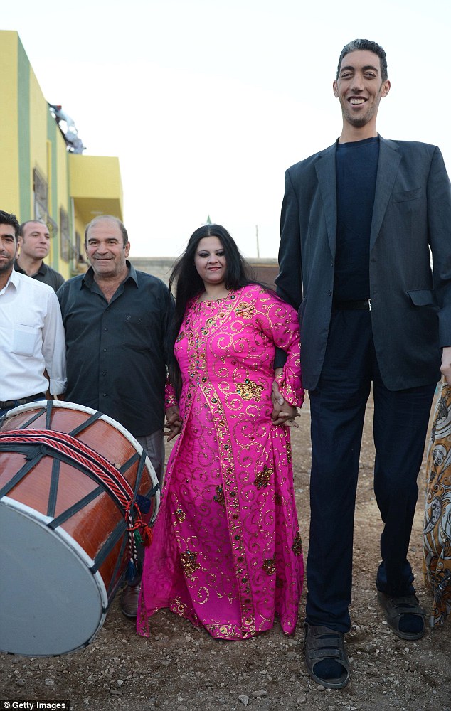 ويبلغ طول العريس سلطان كوسين من تركيا، 2.51 متر وطول زوجته مروة ديبو 1.7 متر، ومع أن قامتها طويلة مقارنة بأي شخص عادي، إلا أنها تبدو قزمة أمام زوجها.