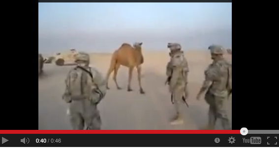 ويظهر في الفيديو الذي انتشر عبر مواقع التواصل الاجتماعي عدداً من الجنود الأمريكيين الذين يركضون هرباً من الجمل وسط ضحكاتهم المتعالية والمستغربة في آن واحد.
