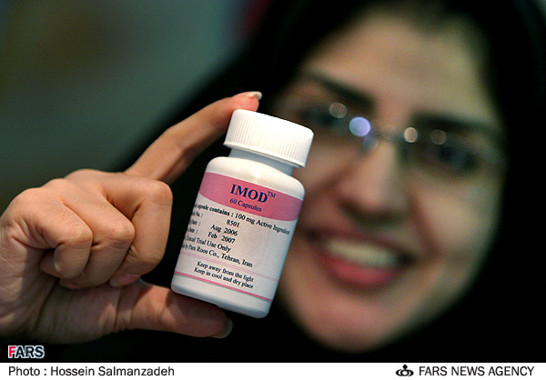 وفي هذا السياق، نقلت وكالة أنباء فارس عن .محرز قولها إن "العقار الجديد الذي يدعى "آيمود" يساعد جهاز المناعة للجسم على تحسين الأداء، ولم يُسجل له اي مضاعفات"، مشيرةً إلى أنّ "العقار يُستخدم حاليًا لمرضى داخل إيران".