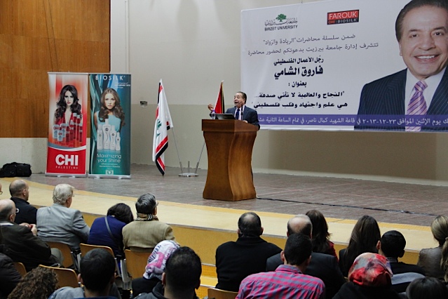 العلم، الأخلاق، الجد والمثابرة" هكذا لخص فاروق الشامي أسس النجاح التي ارتكز عليها في نجاحه، والتي يتوجب على الطلبة الإعتماد عليها للوصول لأعلى المراتب، جاء ذلك خلال محاضرة عامة قدمها الشامي اليوم الإثنين 24 كانون الاول 2013، بعنوان: "النجاح والعالمية لا تأتي صدفة... هي علم واجتهاد وقلب فلسطيني"، وذلك ضمن سلسلة محاضرات "الريادة والرواد"، وبحضور رئيس الجامعة د. خليل هندي وحشد كبير من الهيئة التدريسية والطلبة في الجامعة.