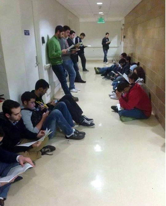 في الصورة التالية التي انتشرت على مواقع التواصل الاجتماعي، يظهر زملاء محمد أمام غرفة العناية المركزة في مستشفى الجامعة الأميركية في بيروت يقرأون من القرآن والإنجيل ويتلون الأدعية له بالشفاء.