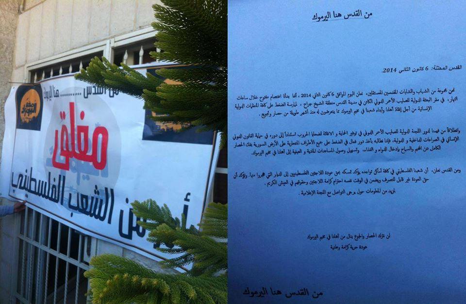 وقال بشار المشني من اللجنة الإعلامية للحملة لوكالة الانباء الرسمية: إن القائمين على الحملة مجموعة من الشباب والشابات المقدسيين المستقلين، وهي عبارة عن اعتصام مفتوح خلال ساعات النهار في مقر اللجنة الدولية للصليب الأحمر الدولي الكائن في مدينة القدس لممارسة الضغط على كافة المنظمات الدولية الإنسانية من أجل إنقاذ أهلنا وأبناء شعبنا في مخيم اليرموك لما يتعرضون له منذ أشهر طويلة من حصار وتجوي