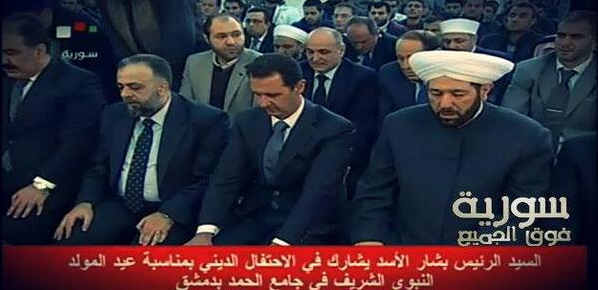 وكتب شريط عاجل على التلفزيون أن "السيد الرئيس بشار الأسد يشارك في الاحتفال الديني لمناسبة عيد المولد النبوي الشريف في جامع الحمد" الواقع في شمال غرب العاصمة السورية، كما نقلت صحيفة الحياة.