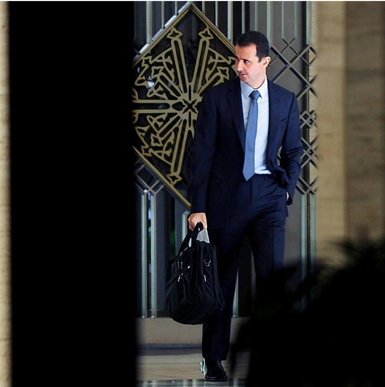 وأظهرت الصورة الأسد يمشي في رواق داخل القصر الرئاسي يوصل الى مكتبه. حاملاً حقيبة سوداء، ومرتدياً بزة كحلية مع قميص وربطة عنق زرقاء. وبدت اللقطة أنها صورت بشكل عفوي، اذ كان الأسد يميل برأسه الى اليمين كأنه ينظر إلى أحدهم، كما قالت صحيفة الحياة.