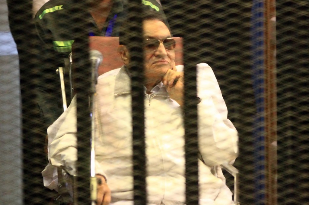 وأظهرت لقطات تلفزيونية بثها التلفزيون المصري مبارك وهو يرتدي ملابس رسمية ويجلس داخل قفص الاتهام في المحاكمة المنعقدة في مقر أكاديمية الشرطة في شمال شرق القاهرة وإلى جانبه نجلاه بملابس السجن البيضاء.