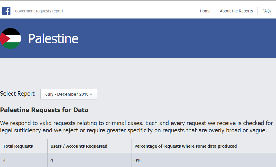 وجدير بالذكر أن فيسبوك لم يستجب للطلبات الفلسطينية التي تلقاها وعددها 4 لأنها كانت لأغراض لا تتعلق بأمور جنائية أو لم تستوفِ شروط الرد.