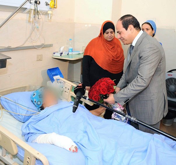 وزار السيسي الضحية التي لم يكشف اسمها كاملاً، يوم الأربعاء الماضي، في مستشفى عسكري ترقد فيه، ونقلت قنوات تليفزيون محلية حديثاً دار بينهما، لكن وجه الضحية بقي مظللا خلال الحديث الذي دار بينهما لدقائق.