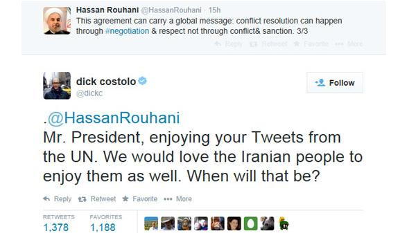 وحينها انتفض الرئيس التنفيذي لـ"تويتر" ديك كوستولو حين وجد روحاني يغرد كما يشاء في حسابيه بالموقع المحروم منه الشعب الإيراني، فاستغلها فرصة وكتب إليه تغريدة تنشر صورتها "العربية.نت" مترجمة من حسابه، وهو باسم @dickc حيث خاطبه: "السيد الرئيس، تمتع بتغريداتك من الأمم المتحدة. كنا نحب أن يتمتع بها الشعب الإيراني أيضا. متى سيكون ذلك"؟