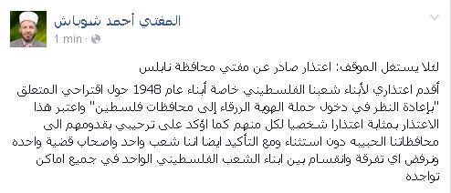 وقال المفتي في تغريدةٍ جديدة عبر موقع فيسبوك:" أقدم اعتذاري لأبناء شعبنا الفلسطيني خاصة أبناء عام 1948 حول اقتراحي المتعلق بإعادة النظر في دخول حملة الهوية الررقاء إلى محافظات فلسطين".