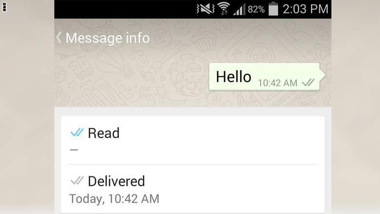 فبمجرد تحول علامتي الصح إلى اللون الأزرق، يعني أن الرسالة تمت قراءتها من قبل المستلم، واثنتين باللون الرمادي تعني أن الرسالة قد وصلت، فيما تعني علامة واحدة باللون الرمادي بأن الرسالة قد أُرسلت فقط، بحسب ما بينت الشركة على موقعها.