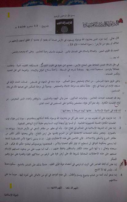 وأضاف الشهود أن أحد الأوراق كانت موجهة إلى القيادي في حركة فتح زياد مطر وجاء فيها : "الى المدعو زياد مطر الكافر الزنديق نحذرك من الخروج من منزلك حتى تاريخ 15/11 حتى لاتكون عرضه لضرباتنا التي ستطال كل الخونه والعملاء من امثالك اللهم قد بلغنا اللهم فاشهد ".