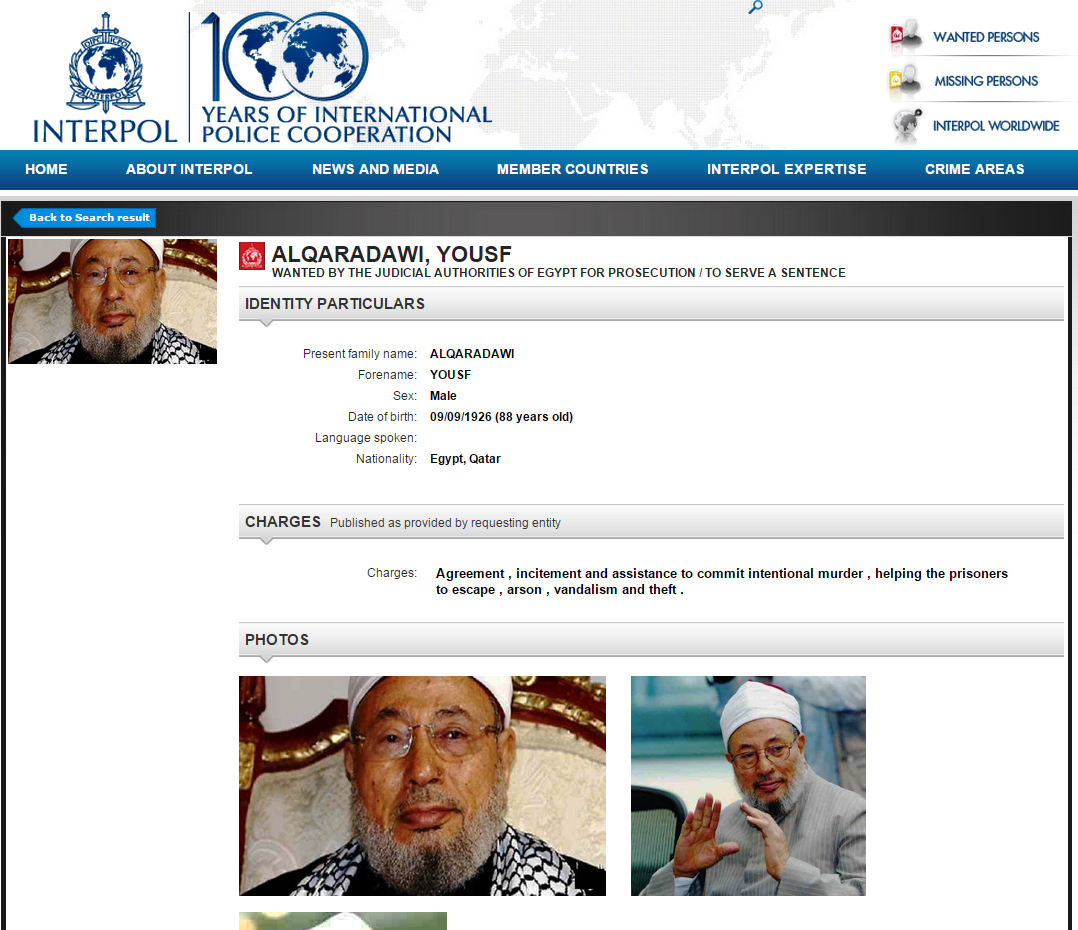 وبحسب ما هو منشور على موقع الإنتربول على الإنترنت، فإن القرضاوي، الذي يحمل الجنسيتين المصرية والقطرية، مطلوب من قبل السلطات المصرية بتهم التحريض والمساعدة على ارتكاب القتل العمد، ومساعدة السجناء على الهرب والحرق والتخريب والسرقة.