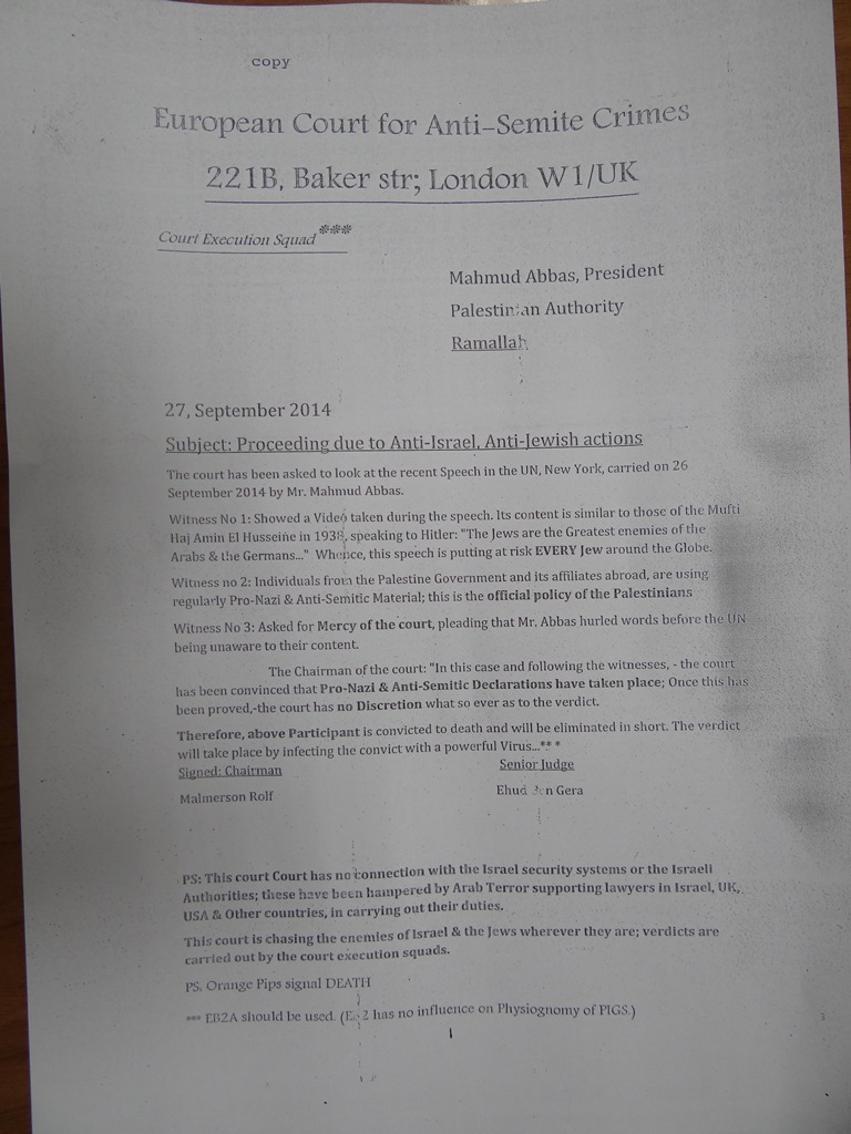كما تضمنت الظرف المغلق رسالة اخرى موجهة للرئيس محمود عباس تحمل ذات المعني لكونه يهدد امن اسرائيل و يشكل خطرا عليها. ووصفت اللجنة الرئيس "بالنازي" حسب نص الرسالة، مطالبين الدكتور الزعتري نقلها للرئيس عباس .