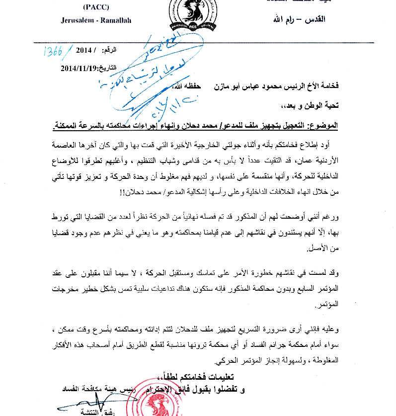 زمن برس، فلسطين: نفت هيئة مكافحة الفساد اليوم، صحة الوثيقة التي نشرتها صحيفة الأخبار اللبنانية، والتي تضمنت رسالة موجهة من رئيس الهيئة رفيق النتشة للرئيس محمود عباس يطالبه فيها بتسريع تجهيز ملف النائب عن فتح محمد دحلان من أجل محاكمته.
