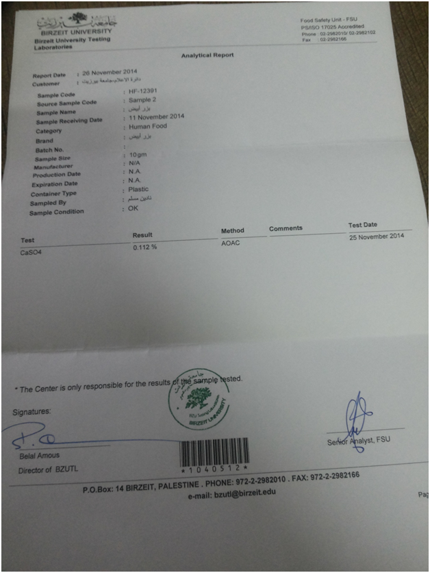 تم أخذ العينات من أكبر المحامص في مدينة رام الله،  واللذين يشهدان اقبالا كبيرا من المستهلكين، ومعروفان بسمعتهما الجيدة بين المواطنين، وتم اجراء الفحوصات المخبرية في مختبرات جامعة بيرزيت وهي مختبرات مستقلة في عملها وتمويلها ومعترف بها من قبل مؤسسة المواصفات والمقاييس، وظهر في نتيجة العينة الأولى ان هناك استخداما واضحا لمادة الشيد وبكميات كبيرة وصلت الى 1.66% وهذه النتيجة صدمت العامل المخبري كدليل واضح على سلبيات استخدام الشيد، بينما ظهرت تحاليل العينة الثانية نسبة 0.112% من مادة الشيد وكانت هذه النتيجة تاكيداً على كذب أصحاب المحامص الذين قابلناهم، حيث أنكروا استخدام مادة الشيد المسرطنة على المدى البعيد.