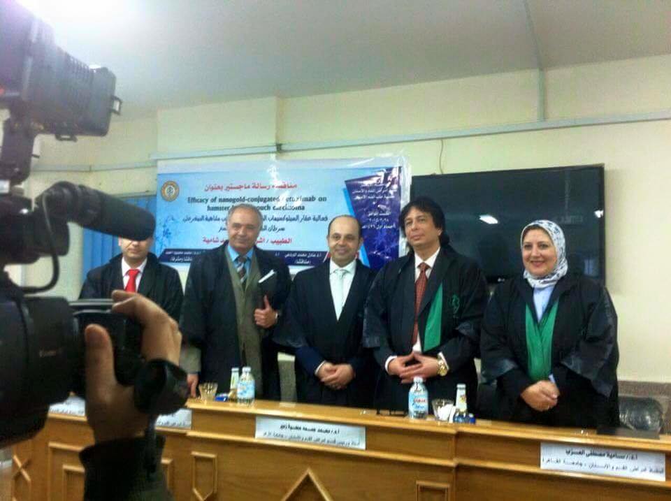 وجاء ذلك خلال مناقشتهُ رسالة الماجستير يوم السبت 28/2/2015، بعنوان فعالية عقار السيتوكسيماب المقترن بجزيئات الذهب متناهية الصغر على السرطان المحدث للجيب الشدقي للهامستر في برنامج (الدراسات العليا بجامعة الازهر - القاهرة)، والتي ينال بموجبها الدكتور أشرف شامية درجة الماجستير من قبل لجنة المناقشة والحكم والتي ضمت كل من الأستاذ الدكتور محمد جمعه عطيه، أستاذ ورئيس قسم أمراض الفم والأسنان، جامعة الأزهر- القاهرة مشرفاً ومناقشاً، والاستاذ الدكتور عادل محمد البردعي مناقشاً داخلياً، والاستاذة الدكتورة سامية مصطفى العزب – جامعة القاهرة مناقشاً خارجياً, والدكتور محمد محمود احمد – جامعة الأزهر مشرفا ومناقشا.