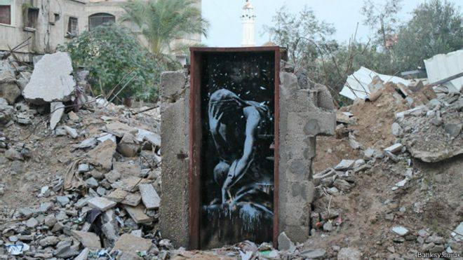 وكان بانكسي رسم ثلاث لوحات جدارية على أنقاض منازل دمرت في العدوان الإسرائيلي على غزة في 2014، خلال زيارة غير معلنة له إلى القطاع. إلا أنه وثق لهذه الزيارة بشريط فيديو بثه على موقع إنستغرام نهاية فبراير الماضي.
