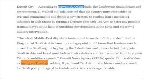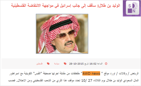 - وعند الرجوع الى جريدة القبس للتأكد من المعلومة تبيّن أنها لم تنشر أي خبر عن الوليد بن طلال في ذلك التاريخ، وكان آخر خبر نشرته عن الوليد في 30/10/2015، أي بعد ادعاء موقع”AWD” على الجريدة.