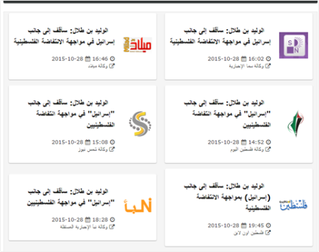 - تداول عددٌ من المواقع الإخبارية الفلسطينية وغير الفلسطينية خبراً مفاده أن الوليد بن طلال سيقف الى جانب اسرائيل لمواجهة الانتفاضة الفلسطينية، ومن هذه المواقع: وكالة سما الاخبارية، دنيا الوطن، فلسطين اليوم، شمس نيوز..
