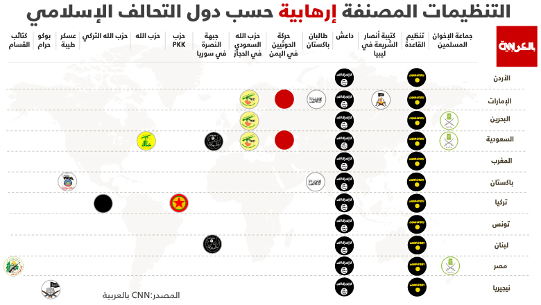 ونشرت سي أن أن بالعربية رسم انفوجرافيك يوضح نظرة دولا بالتحالف لعدد من الجماعات والتنظيمات في المنطقة والعالم.